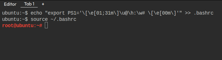 echo “export PS1=‘\[\e[01;31m\]\u@\h:\w# \[\e[00m\]’” >> .bashrc source ~/.bashrcYou will now see this view: