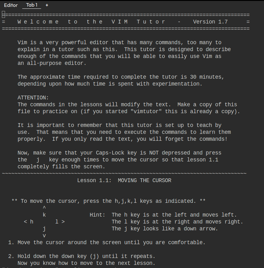 Open your terminal and type vimtutor. You will get a response similar to: